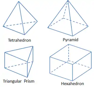 The basic 3-dimensional element are the tetrahedron, quadrilateral pyramid, triangular prism, and hexahedron. They all have triangular and quadrilateral faces.