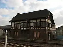 The Quedlinburg wagon factory (Quedlinburger Waggonfabrik), founded in 1927 was south of the Bode and west of the former Schäferwiese ("shepherd meadow"). It had a connection to the Quäke at kilometre 16.20. Tanker and acid pot wagons were mainly repaired here, less frequently other freight wagons and also passenger carriages until the 1960s. More than 300 acid pot wagons were manufactured in Quedlinburg from 1936 to 1964.[26] As an independent company, the factory had about 60 employees. The operation became part of the Einheit repair shop in Leipzig in 1971. There were no own locomotives for shunting on site, so they had to be requested when needed. Steam and diesel locomotives were used here until 1972, afterwards a Kö II locomotive was used until 1988 and a V 60 locomotive was used until its closure on 31 December 1993. After the suspension of passenger traffic on the Quäke, platform 1 West of the station was also used as a siding. But parts of the line to Weddersleben served as a shunting area. After its closure in late 1993, the buildings were offered for sale. Due to their dilapidated condition, parts of the roof collapsed on 6 April 6, 2004[27] and they were demolished in early 2005.