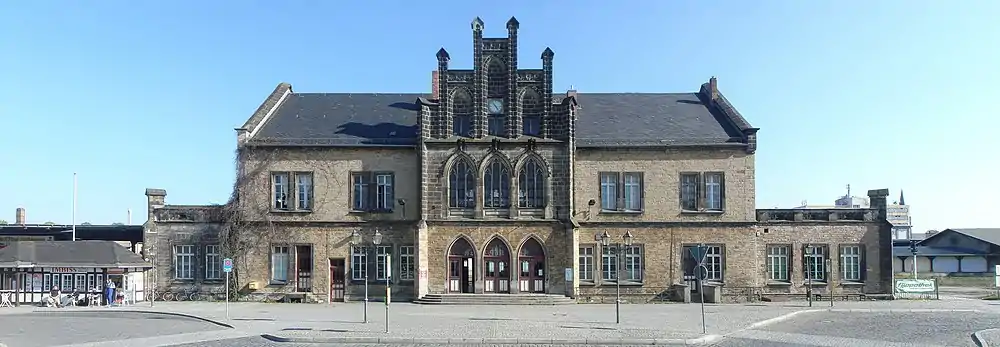 Quedlinburg station is a station on the Magdeburg–Thale railway in Quedlinburg in the German state of Saxony-Anhalt. It was built in 1862 as a through station on the southern edge of the town. The Gothic Revival entrance building of 1862, together with the other parts of the nearly complete Gründerzeit ensemble, is heritage-protected.