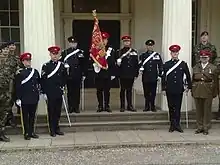 The Guidon, which is awarded by The Queen, is a flag of crimson silk damask embroidered and fringed with gold with the Regimental Battle Honours emblazoned upon it and the Regimental emblem embroidered in the centre. On 22 September 2007 Prince Charles, in his capacity as Royal Honorary Colonel of The Queen's Own Yeomanry, presented a new Guidon to the Regiment in an hour-long ceremony in the grounds of Alnwick Castle. This was the first Guidon the QOY has received since its formation.[12]