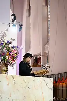 Following the singing of "Hine e Hine", Erana Ngarimu, Head Girl of St Mary's College, read the Gospel, John 10: 11-16. This was followed by the singing of "The Lord's My Shepherd", which was sung at the wedding of Princess Elizabeth and Philip Mountbatten in 1947. The Governor-General, Dame Cindy Kiro, then gave an address and paid tribute to the Queen.[17] She said:[18]
