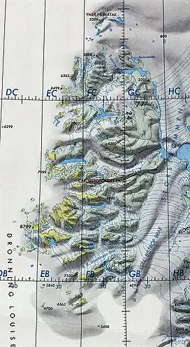 Queen Louise Land (Danish: Dronning Louise Land;[2] Greenlandic: Nuna Dronning Louise)[3] is a vast mountainous region located west of Dove Bay, King Frederick VIII Land, northeastern Greenland. Administratively it is part of the Northeast Greenland National Park zone.
