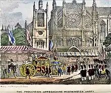 Prior to 1838, only the peerage had taken part in a coronation. The day's ceremonies would have begun in Westminster Hall, (now attached to the Houses of Parliament), and upon their completion, peers would have walked together across the road to Westminster Abbey, where they witnessed the monarch being crowned.[8] In accordance with Melbourne's new plan, however, the traditional ceremonies in Westminster Hall and the procession to the Abbey were replaced with two much longer processions through London. Victoria travelled inside the Gold State Coach (also known as the Coronation Coach), made for George III in 1762, as part of a procession which included many other coaches, and a cavalry escort.[3][14] According to The Gentleman's Magazine it was the longest coronation procession since that of Charles II in 1660.[3][14][15] A large proportion of the budget was used to pay for the procession and so there was no coronation banquet.[3]