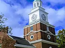 It is four bays wide and has a six-stage, square tower featuring a second story Palladian window. The tower has an octagonal belfry topped by a smaller cupola and spire.[2][3]