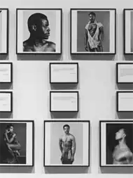American conceptual artist Glenn Ligon provided an artistic response that critiqued both the conservative ideology that stoked the culture wars and Mapplethorpe's problematic imagery of queer black men.[27] Responding to Mapplethorpe's The Black Book (1988), a photographic series of homoerotic nude black men that failed to consider the subjects within broader histories of racialised violence and sexuality, Ligon created the work Notes on the Margin of the Black Book (1991-1993).[25] Shown at the 1993 Whitney Biennial, Ligon framed every page of Mapplethorpe's book in its original order, installing them in two rows on a wall, between them inserting around seventy framed texts relating to race from diverse sources, such as historians, philosophers, religious evangelists, activists, and curators.[25] By suggesting Mapplethorpe's work to be a projection of fears and desires upon the black male body, Ligon demonstrates the entanglement of sex, race, and desire, part of his larger practice of investigating the construction of black identity through words and images.[25]