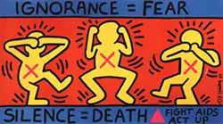Keith Haring notably deployed his practice to generate activism and advocate for awareness about AIDS in the final years of his life, as seen with the poster Ignorance = Fear (1989), or the acrylic on canvas painting Silence = Death (1989), both of which invoke the iconic poster and motto.[20][21]