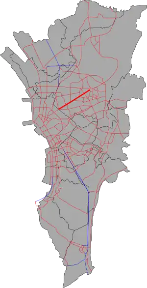 The entire route is located in Quezon City. Intersections are numbered by kilometer post, with Rizal Park in Manila designated as kilometer zero.