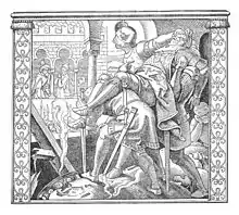 Rüdiger is noted for his hospitality and kindness throughout the story,[2] and offers his daughter's hand in marriage to Giselher of Burgundy. While escorting the Burgundian envoy to Kriemhilde, he swears his absolute protection to them. However Kriemhilde takes offence at the actions of Hagen and demands Rüdiger assist her in warring against him. Caught between the conflicting loyalties, Rüdiger is asked by Hagen in the middle of the ensuing battle to fulfill his earlier vow and give up his battle-shield to Hagen who has lost his own, despite fighting on the opposite side. Rüdiger complies, and is then killed by Gernot who is wielding a sword that Rudiger had likewise gifted him.