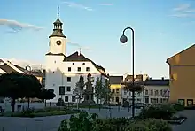 The Roman Catholic parish Church of Saint Michael is originally a Gothic building. Its existence is proven already in the first half of the 14th century. After the fire in 1609 it was reconstructed in the Renaissance style. The original gothic tower was equipped with a wooden porch and a helmet with four turrets in the corners, the slender gothic windows were partly walled up. After the fire in 1790, a reconstruction took place during which Neoclassical and Neorenaissance elements were added. The alterations were not completed until 1818 by restoring the church tower to its present appearance. The interior of the church is decorated with paintings of Johann Christoph Handke.[9]