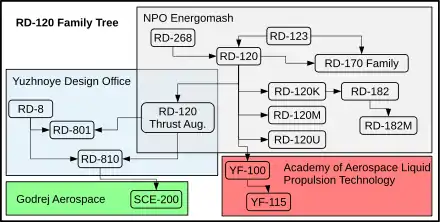 Not considering straight variations of the RD-120, this very influential engine has been the foundations of many engines spanning derivatives in four countries. The Ukrainian RD-801 and RD-810, the Chinese YF-100 and YF-115, as well as the Indian SCE-200 can be traced directly back to the RD-120. The Soviet/Russian RD-170 family of engines base developed on the lessons learned from the RD-120 project.