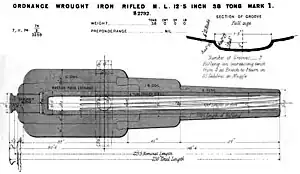 The gun originated from a desire for a longer 12 in (30 cm) gun than the existing RML 12-inch 35-ton gun. Experiments in 1874 with both 12 in (30 cm) and 12.5 in (32 cm) versions 3 ft (91 cm) longer than the existing 12 in (30 cm) gun showed the 12.5 in (32 cm) calibre was more suitable, and further experiments showed a projectile of 800 lb (360 kg) could be fired with a charge of 130 lb (59 kg) of P2 gunpowder without undue strain. The same construction as in the existing 12 in (30 cm) 35-ton gun was used : a mild steel "A" tube toughened in oil, surrounded by wrought iron "B" tube, triple coil in front of the trunnion, coiled breech-piece and breech coil. This was approved in January 1875.[4]