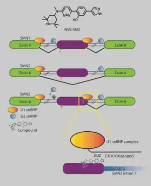 - 1 2 Palacino, James; Swalley, Susanne E; Song, Cheng; Cheung, Atwood K; Shu, Lei; Zhang, Xiaolu; Van Hoosear, Mailin; Shin, Youngah; Chin, Donovan N; Keller, Caroline Gubser; Beibel, Martin; Renaud, Nicole A; Smith, Thomas M; Salcius, Michael; Shi, Xiaoying; Hild, Marc; Servais, Rebecca; Jain, Monish; Deng, Lin; Bullock, Caroline; McLellan, Michael; Schuierer, Sven; Murphy, Leo; Blommers, Marcel J J; Blaustein, Cecile; Berenshteyn, Frada; Lacoste, Arnaud; Thomas, Jason R; Roma, Guglielmo; et al. (2015). "SMN2 splice modulators enhance U1–pre-mRNA association and rescue SMA mice". Nature Chemical Biology. 11 (7): 511–7. doi:10.1038/nchembio.1837. PMID 26030728.