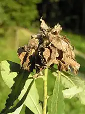 The gall consists of from thirty to sixty leaves,[2] shortened and crowded together in rosettes on white willow (S. alba), crack willow (S. fragilis), goat willow (S. caprea) and purple willow (S. purpurea) willows as well as the eared sallow (S. aurita) and grey sallow (S. cinerea).[1] The oviposition of this species results in a chemical interaction that halts the lengthwise growth of infected willow shoots, the leaves however continue to develop and thus the characteristic "rose" forms at the tip of the affected shoot.[3]
