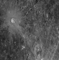 ![]() MESSENGER image. Raden Saleh is the crater with bright rays in the upper left. | |