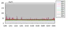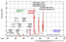 Radiation fluctuated widely on the site after the tsunami and often correlated to fires and explosions on site. Radiation dose rates at one location between reactor units 3 and 4 was measured at 400 mSv/h at 10:22 JST, 13 March, causing experts to urge rapid rotation of emergency crews as a method of limiting exposure to radiation.[100] Dose rates of 1,000 mSv/h were reported (but not confirmed by the IAEA)[101] close to the certain reactor units on 16 March, prompting a temporary evacuation of plant workers, with radiation levels subsequently dropping back to 800–600 mSv/h.[102] At times, radiation monitoring was hampered by a belief that some radiation levels may be higher than 1 Sv/h, but that "authorities say 1,000 millisieverts [per hour] is the upper limit of their measuring devices."[103]