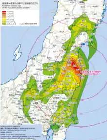 The radiation effects from the Fukushima Daiichi nuclear disaster are the observed and predicted effects as a result of the release of radioactive isotopes from the Fukushima Daiichii Nuclear Power Plant following the 2011 Tōhoku 9.0 magnitude earthquake and tsunami (Great East Japan Earthquake and the resultant tsunami).[3][4] The release of radioactive isotopes from reactor containment vessels was a result of venting in order to reduce gaseous pressure, and the discharge of coolant water into the sea.[5] This resulted in Japanese authorities implementing a 30-km exclusion zone around the power plant and the continued displacement of approximately 156,000 people as of early 2013.[4][6] The number of evacuees has declined to 49,492 as of March 2018.[7] Radioactive particles from the incident, including iodine-131 and caesium-134/137, have since been detected at atomospheric radionuclide sampling stations around the world, including in California and the Pacific Ocean.[8][9][10]