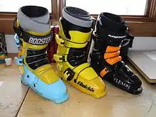 The Flexon was a downhill ski boot introduced by Raichle in the winter of 1980/81. Based on designs by Sven Coomer, Al Gross and Erik Giese, the Flexon used a unique system to control forward flex in a predictable way, as well as making the boot more comfortable and easier to put on and remove. The basic layout was, and is, generally referred to as a "three-piece" design -- three-piece boots preceding the Flexon included the Henke Strato, Nordica Comp 3 and a dozen other designs from Italian bootmakers.
