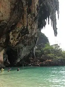 Railay (Thai: ไร่เลย์, pronounced [râj lēː]), also known as Rai Leh, is a small peninsula between the city of Krabi and Ao Nang in Thailand.[1] It is accessible only by boat due to high limestone cliffs cutting off mainland access. These cliffs attract rock climbers from all over the world, but the area is also popular due to its beautiful beaches and quiet relaxing atmosphere. Accommodation ranges from bungalows and medium-priced resorts in East Railay to a collection of luxury resorts focused on West Railay, though one, Royavadee, spans both waterfronts and also has a beachfront restaurant at Ao Phra Nang. The four main areas of Railay consist of Phra Nang, West Railay, East Railay, and Ton Sai. Ton Sai caters to climbers and the backpacker set and is more rustic than the glitz of West Railay and the shops and restaurants of the East Railay boardwalk.