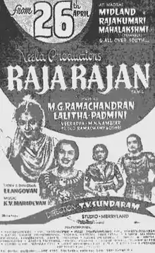 Raja Rajan (transl. King of kings)[2] is a 1957 Indian Tamil-language film starring M. G. Ramachandran, Padmini and Lalitha. The film was released on 26 April 1957,[3] and did not do well at box-office, running for just above 50 days in theatres.