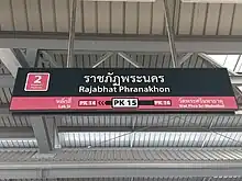 Rajabhat Phranakhon station (Thai: สถานีราชภัฏพระนคร) is a Bangkok MRT station on the Pink Line. The station is located on Chaeng Watthana Road, near Phranakhon Rajabhat University in Lak Si district, Bangkok.[1] The station has four exits.[2] It opened on 21 November 2023 as part of trial operations on the entire Pink Line.[3][4]