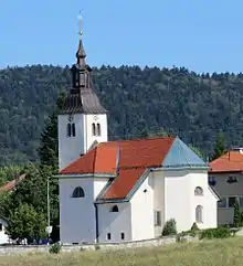 The local parish church is dedicated to the Holy Cross and belongs to the Roman Catholic Archdiocese of Ljubljana. It was built in the 17th century on the site of an earlier building, mentioned in written documents dating to 1420.[5] The year 1677 is carved into the door casing of the church. The main altar and the side altar dedicated to Saint Martin are said to have been brought from Bistra; they are marble works dating from the end of the 17th century. The main altar painting is the work of Henrika Langus (1836–1876). The church was elevated to the seat of a parish in 1766.[3]