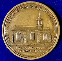 The reverse of this medal showing the Southampton Church St Mary 1722 after the rebuilding by Brideoake
