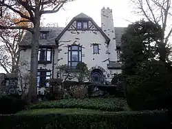 The style of which this house was built is a neo-Tudor style.[3] It was designed by the prominent Brooklyn architects Koch & Wagner.[3] The house stands at 2+1⁄2 stories and is faced in stucco pierced by random bricks and stones.[3] The house maintains its original wooden doors with iron strapping; the original leaded glass windows and slate roof are also maintained.[3] It is located in a suburban setting of single-family homes and is surrounded by mature trees and bushes.[3] The house is also situated on the crest of a hill and contains a terraced flagstone walkway leading from the street to the front door.[3] The house's attached gable is inset into the hill at the basement level.[3] The house is faced with random ashlar stones and has an opening that is stone-framed and arched segmentally; this opening is filled by wooden doors with small plain glass lights and metal strapping.[3] The house is three bays wide with a central, full height, projecting gable capped/adorned by a clipped roof.[3] The doorway, within the gable, is built within a round arched, stone-trimmed opening and holds a wooden door with a small, rectangular window covered by a decorative iron grille.[3] There is an original iron and glass lantern situated on the wall beside the door.[3] Additionally, there is a small, rectangular window within the gable above the doorway, along with a large, double-height window to the side of the entrance.[3] This window has leaded glass casements with a decorative stained glass motif of a knight on horseback at the bottom center of the window; this window is fronted by a small, iron balcony.[3] A pair of small rectangular windows are built near the top of the gable and are surrounded by half-timber framing.[3] There is a stucco-faced chimney on one side of the central gable.[3] The lower section of the chimney projects toward the front and creates another small roof and shape variety.[3] There is a small, open stone porch on the west side of the house's main section, while the east side contains a one-storey, stone-faced sun room with floor-to-ceiling casement windows.[3] This area is recessed behind a patio and the stone walls that rise up from the garage below.[3]