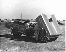 Debuting in 1969, Rambunctious is a reproduction 1969 Dodge Charger on a Logghe Stamping Company chassis. It became one of the most famous (and popular) funny cars in NHRA history.[1] It would record NHRA's first official 200 mph (320 km/h) pass, driven by Gene Snow and powered by a Keith Black-prepared Chrysler hemi.[2]
