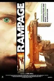 Rampage is a 2009 action film written and directed by Uwe Boll and starring Brendan Fletcher, Michael Paré, Shaun Sipos and Lynda Boyd.[1] It received a theatrical release in Germany, though was released direct-to-video in the rest of the world. It was Boll's first film to gain mainly positive reviews. The film was followed by two sequels Rampage: Capital Punishment (2014) and Rampage: President Down (2016).