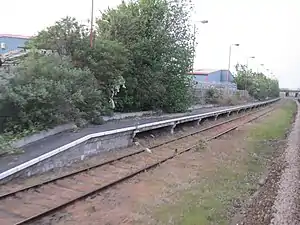 Ramsline Halt is a disused single-platform railway station in the Pear Tree area of Derby, England. It was opened by British Rail in 1990 to serve football specials bringing away supporters to the Baseball Ground, then the home stadium of Derby County F.C. The station cost £320,000 to build, partly funded by the Football Trust, but only four trains ever stopped there.[1] In 1997 Derby County moved to the new Pride Park Stadium and Ramsline Halt closed. In spite of this, it remains in reasonable condition. There is no current access to it, but it can be seen from Osmaston Road. The station name board is now at the National Football Museum.