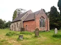 The building was renovated in 1753, when the chancel was built. The east window was probably put in at this time. The bell turret was removed in 1889, but was re-erected in the 1940s in memory of Frank Russell and John Owen Timms, two local men who lost their lives in the Second World War. The new turret was not strong enough to support the bells, which had to be removed and put onto storage until the turret was rebuilt.[3] The church has a small bell-tower at the west end of the nave with two bells, and was repaired and a gallery erected in 1840. The restoration was supervised by Staffordshire ecclesiastical architect Andrew Capper.[4] The parish registers commence in 1655. The original registers for the period 1655-1993 (Baptisms), 1655-1984 (Marriages) & 1655-1993 (Burials) are deposited at Staffordshire Record Office. Bishops Transcripts, 1660-1868 (with gaps 1840–1854) are deposited at Lichfield Record office.[5]