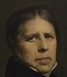 Raphael and La Fornarina is an oil painting on canvas executed in 1813, in Italy, by Jean-Auguste-Dominique Ingres.[1] It is the first of five versions of the painting he produced between 1813 and his death in 1867.[2] In 1814 his first version was exhibited at the Salon.[3] The work shows the renowned painter, Raphael, sitting in his studio with his mistress, La Fornarina (the baker), on his knee. His embrace reflects his affection and desire for her, while his gaze towards his own artwork, his portrait of his mistress, indicates his love for art.[4] This contrast represents the painter's major conflict between who he loves and what he loves.[4] The mistress makes eye contact with the viewer and her posture, specifically her arms resting on his shoulders, shows how proud and satisfied she is with being his mistress and inspiration.[4] The Fornarina's sensual gaze at the viewer claims her importance and place both within the artist's studio and profession.[5]