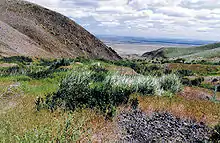 The Rattlesnake Hills, also known as Rattlesnake Ridge,[3] is a 16-mile (26 km) long anticline mountain ridge in Yakima County and Benton County in the U.S. state of Washington. It should not be confused with the much smaller Rattlesnake Ridge located near the west end of Ahtanum Ridge just south of Yakima, Washington and west of Union Gap, Washington.[4] The highest point in the hills (as well as Benton County) is the 3,629 feet (1,106 m) Lookout Summit, which surpasses the more well-known Rattlesnake Mountain by approximately 100 ft (30 m).[1] The Rattlesnake Hills are part of the Yakima Fold Belt of east-tending long ridges formed by the folding of Miocene Columbia River basalt flows.[5]