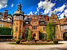 After taking over ownership, Stumm commenced construction activity on the estate by demolishing the old moated castle, the adjacent farm and the tithe barn.[4] On the hill behind it, Stumm built a new manor house, called Rauischholzhausen Castle, and nearby farm yard. Architect Carl Schäfer was commissioned to design the castle in the style of Klein-Potsdam,[5] and the park was designed by Heinrich Siesmayer, the creator of the Frankfurt Palmengarten.[6][7] Construction took place between 1871 and 1878, however, the building collapsed in 1873, because of poor foundation work. Carl Jonas Mylius and Alfred Friedrich Bluntschli (students of Gottfried Semper), were hired to redesign the castle in line with Schaefer's original designs. Construction of the roof and the south-east wing was completed in 1875 and the main building was completed a year later with the half-timbered section of the building completed in 1878.[8]