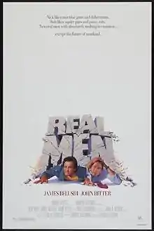Real Men is a 1987 American comedy film starring James Belushi and John Ritter as the heroes: suave, womanizing CIA agent Nick Pirandello (Belushi) and weak and ineffectual insurance agent Bob Wilson (Ritter).[2]