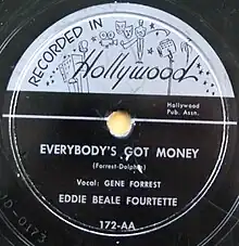 Despite releasing several successful recordings, by 1953 the label was in significant financial trouble, and it was sold to Don Pierce of Starday Records.[1] Pierce then changed the name to Hollywood Records.[1] Pierce found near immediate success with Linda Hayes and her song "Take Me Back", which sold 150,000 copies.[1] Dolphin also introduced Pierce to Jack Lauderdale of Swing Time Records.[1] It was through this contact that Pierce acquired the rights to several earlier Swing Time recordings.[1] As a result, Hollywood sold Christmas records by Lowell Fulson, Charles Brown and Mabel Scott, which moved tens of thousands of copies on a perennial basis.[1]