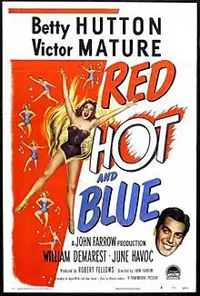 Red, Hot and Blue is a 1949 American musical comedy film directed by John Farrow and starring Betty Hutton, Victor Mature, William Demarest and June Havoc. It was released by Paramount Pictures. Hutton plays an actress who gets mixed up with gangsters and murder. Frank Loesser wrote the songs and plays a key role. The film has no connection to Cole Porter's play of the same name.