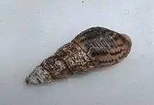 The red-rimmed melania (Melanoides tuberculata),[3][4] also known as Malayan livebearing snails or Malayan/Malaysian trumpet snails (often abbreviated to MTS) by aquarists, is a species of freshwater snail with an operculum, a parthenogenetic, aquatic gastropod mollusk in the family Thiaridae.