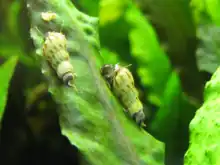 Red-rimmed melania females are both parthenogenic and ovoviviparous.[6][28] Females can be recognized by their greenish coloured gonads while males have reddish gonads. Under good conditions, females will produce fertilised eggs that are transferred to a brood pouch where they remain until they hatch (parthenogenesis and viviparity).[23] Melanoides tuberculata has 1–64 embryos in its brood pouch.[28] Snails will begin reproducing at a size as small as 5 millimetres (1⁄4 in)[28] or 10 millimetres (3⁄8 in) in length and broods may contain over seventy offspring (iteroparity).[5] The size of the shell of the parent at peak release of juveniles is 20.0 millimetres (3⁄4 in).[28] The size of juveniles at birth is 1.2–2.2 millimetres (3⁄64–11⁄128 in).[28]