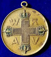 The Red Cross Medal was a German medal set up on 1 October 1898 by Wilhelm II. It had three classes and could be awarded to all those who carried out great service to the sick in peace or wartime, or for special achievement in the service of the German Red Cross. Though service to the sick during times of war had been recognized with prior awards of the Order of the Crown and General Honor Decorations with the Red Geneva Cross, Empress Augusta Victoria the royal patroness of the organization wanted an award to recognize work in peacetime as well.[3]