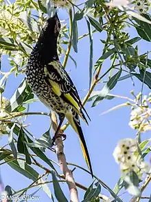 First described by the English naturalist George Shaw in 1794, the regent honeyeater was moved to Anthochaera in 1827 by the naturalists Nicholas Aylward Vigors and Thomas Horsfield.[2] It was known as Xanthomyza phrygia for many years, the genus erected by William John Swainson in 1837. DNA analysis shows that its ancestry is in fact nested within the wattlebird genus Anthochaera. The ancestor of the regent honeyeater split from a lineage that gave rise to the red and yellow wattlebirds. The little and western wattlebirds arose from another lineage that diverged earlier.[3] The generic name Anthochaera derives from the Ancient Greek anthos 'flower, bloom' and khairō 'enjoy'; the specific epithet phrygia derives from Latin phrygius, referring to the people of Phrygia who were skilled in embroidery with gold.[4]