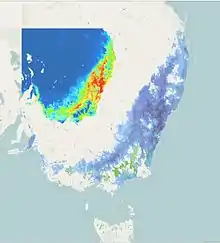 The regent honeyeater was once common in wooded areas of eastern Australia, especially along the inland slopes of the Great Dividing Range. It once could be found as far west as Adelaide, but is now gone from South Australia and western Victoria.[7] As of June 2020 their range covers from north-east Victoria up to around the Sunshine Coast, Queensland,[8] but the population is now scattered. Most sightings are from a few sites in north-eastern Victoria, along the western slopes of the Great Dividing Range in New South Wales and the central coast of New South Wales.[9] In 1999 the three main breeding areas were the Bundarra-Barraba area and Capertee Valley of New South Wales, and north-eastern Victoria.[10]