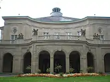 Situated between the Kurgarten (spa garden) and the river Fränkische Saale, the Regentenbau completed the spa area of Bad Kissingen. It was the conclusion of the comprehensive building contract in the royal spa, which Luitpold of Bavaria had given in 1905 to Max Littmann as "special commissioner for the state's new buildings in the royal spa garden".[2] This order, for which the Bavarian government released funding in 1910, included also the construction of the Wandelhalle (promenade hall) and the renovation and structural integration of the older Arkadenbau of Friedrich von Gärtner, a 200-meter-long arcade building from 1838 with its hall Conversationssaal (today Rossini-Saal), to the Regentenbau.