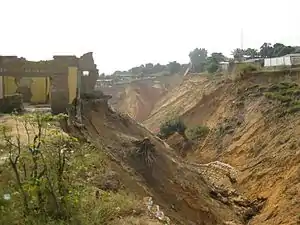 In 1998, a wall in the Regional Center for Nuclear Studies collapsed when torrential rains undermined the building's foundation.[13] International Atomic Energy Agency officials have voiced concerns that the ongoing issue with erosion could lead to an accident that might contaminate the city of Kinshasa's water supply. Further concerns about the site were raised when, in 1999, an object that might have been a missile, struck the building and caused light damage.[14]