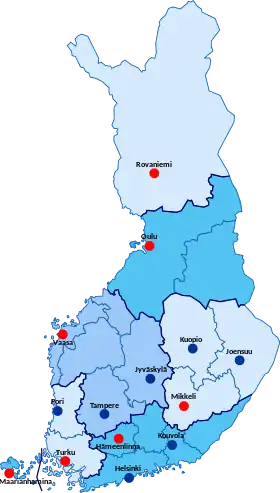 The agencies themselves do not constitute a subdivision of Finland (ISO 3166-2:FI); instead, the first-level subdivisions are the regions of Finland. The other important set of top-level regional state agencies are the Centres for Economic Development, Transport and the Environment (ely-keskus).