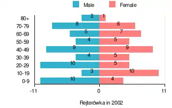 According to the 2002 Poland census, there were 108 people residing in Rejterówka village, of whom 51.9% were male and 48.1% were female. In the village, the population was spread out, with 23.1% under the age of 18, 30.6% from 18 to 44, 20.4% from 45 to 64, and 25.9% who were 65 years of age or older.[1]