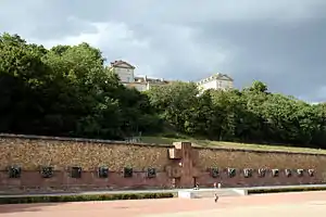 After the war Renée Lévy's remains were returned to France and buried at Fort Mont-Valérien in Suresnes during an impressive ceremony on 11 November 1945. Fifteen resistance fighters were reburied during the ceremony, including two women – Renée Lévy and Berty Albrecht.[1] The fifteen bodies, which had been kept at the Arc de Triomphe beside the grave of the Unknown Soldier, had great symbolic importance, representing the dead of the different battles. Eleven had died "facing the enemy" and four represented the martyrs of France.[4][lower-alpha 1] The presence of Renée Levy symbolized the re-acceptance of the Jews as a part of the nation, after their exclusion during the Vichy period.[6] Of at least equal importance, she and Raymond Bigosse represented the deported resisters.[5]
