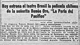 - ↑ "Hoy estrena el teatro Brasil la película chilena de la señorita Renée Oro, "La perla del Pacífico"". El Mercurio (in Spanish). Santiago. 27 June 1924. Retrieved 11 March 2023 – via Cinechile.