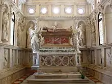 Work on Šibenik cathedral inspired Nicola in his work on the expansion of the Chapel of Blessed John of Trogir in 1468. Just like Šibenik cathedral, it was composed out of large stone blocks with extreme precision. In cooperation with a disciple of Juraj, Andrija Aleši, Nicola achieved a unique harmony of architecture and sculpture according to antique ideals. From inside, there is no flat wall. In the middle of the chapel, on the altar, lies the sarcophagus of blessed John of Trogir. Surrounding this are reliefs of putti carrying torches that look like they were peeping out of doors of Underworld. Above them there are niches with sculptures of Christ and the apostles, amongst them are putti, circular windows encircled with fruit garland, and a relief of the Nativity. This is all covered with a coffered ceiling with an image of God in the middle and 96 portrait heads of angels. With so many faces of smiling children the chapel looks very cheerful and there isn't anything similar in European art of that time.