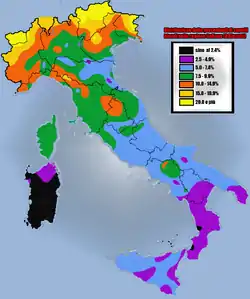 Percentage of blond hairs in the Italian regions and Corsica (France), from the studies of Renato Biasutti done in 1941